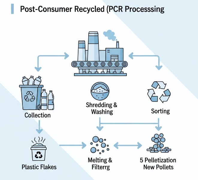 PCR znamená Post-Consumer Recycled Content alebo Post-Consumer Resin. Je to pravdepodobne najefektívnejšia voľba materiálu v obehovom hospodárstve, pretože rieši tú jedinú najväčšiu výzvu: existujúci odpad, ktorý by inak skončil na skládkach alebo znečistil oceány.